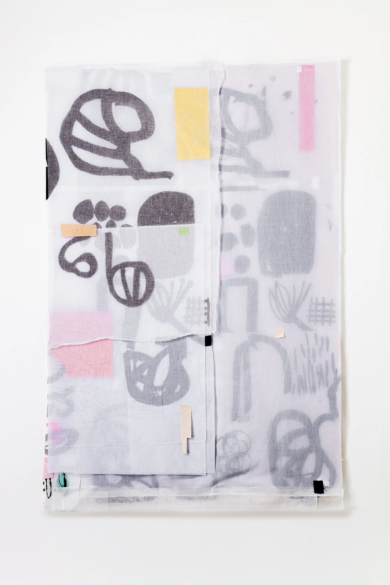 Left: Detail of Deborah Newmark On and On Right:Install North Wallwwith work by Victoria Fuller, Deborah Newmark and Spencer Gale
